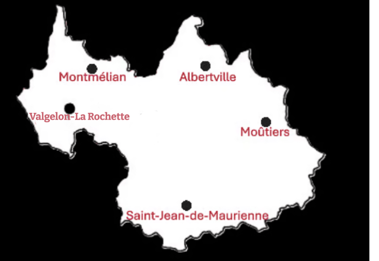 Aiton, Aiguebelle, Arbin, Argentine, Albertville, Brides-les- Bains, Cevins, Chamousset, Cléry, Cruet, Epierre, Esserts-Blay, Feissons-sur-Isère, Francin, Frontenex, Gilly-sur-Isère, Grand-Aigueblanche Grésy-sur-Isère, Valgelon-La-Rochette, La Bâthie, La Léchère, La Chapelle, Les Allues, Les Belleville, Saint-Martin-de-Belleville, Les Marches, Marthod, Montmélian, Myans, Moûtiers, Rognaix, Saint-Alban d'Hurtières, Saint-Georges d'Hurtières, Ste-Hélène-du-Lac, Saint-Paul-sur-Isère, Saint-Pierre-d'Albigny, , Tours-en-Savoie, Tournon, Ugine, Les Menuires, Courchevel, La Tania, Valmorel, Méribel.